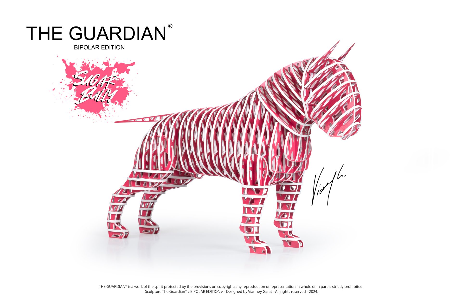 The Guardian® Bipolar, ode à l'English Bull-Terrier, révèle la complexité de cette race. À travers un jeu subtil de lumières et d'ombres, de reliefs et de creux, la sculpture incarne la force tranquille et la sensibilité délicate de ce chien. La dualité de son caractère, un mélange de fougue et de tendresse, de détermination et de douceur, est sublimée par les nuances chromatiques. Chaque pièce, unique et empreinte de l'âme de l'artiste, invite à une contemplation profonde.